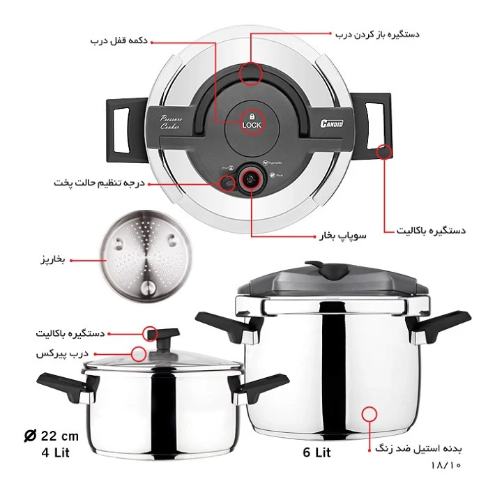 زودپز دوقلو کاندید مدل هلیوس حاوی دیگ 6 لیتر بعلاوه دیگ اضافی 4 لیتری و بخارپز ساخته شده از استیل 304 ضدزنگ 18/10 است . این زودپز از برند معتبر کاندید دارای تنظیم حالت پخت مناسب برای مواد غذایی مختلف میباشد. زودپز دوقلوی هلیوس دارای 3 سوپاپ: قفل ایمنی، تخلیه بخار و سوپاپ اطمینان با بالاترین کیفیت و ایمنی تولید شده است.